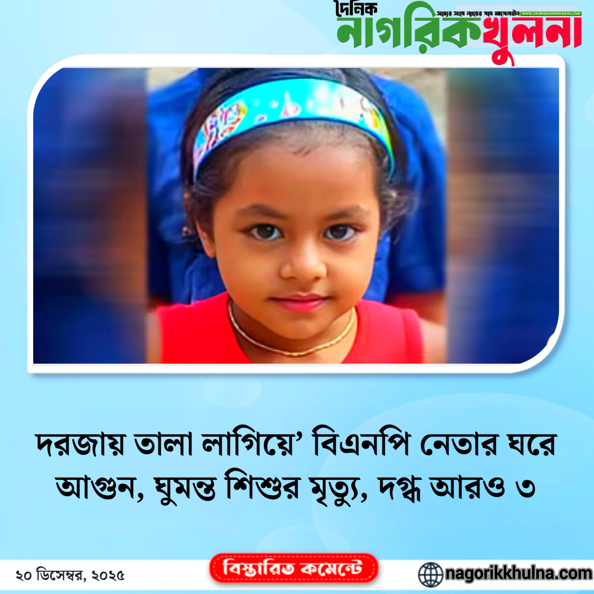 আগুনে পুড়ে মারা যাওয়া শিশুর নাম আয়েশা আক্তার। দগ্ধ তিনজন হলেন বেলাল হোসেন (৫০) ও তাঁর দুই মেয়ে বীথি আক্তার (১৭) ও স্মৃতি আক্তার (১৪)। এর মধ্যে বীথি আক্তার ও স্মৃতি আক্তারকে চিকিৎসার জন্য জাতীয় বার্ন ও প্লাস্টিক সার্জারি ইনস্টিটিউটে পাঠানো হয়েছে। বেলালকে সদর হাসপাতালে চিকিৎসা দেওয়া হচ্ছে। আগুনে বেলাল হোসেনের ঘরটিও পুড়ে ছাই হয়ে গেছে।